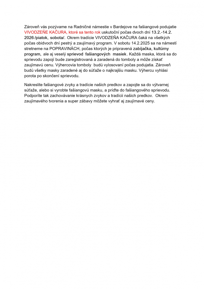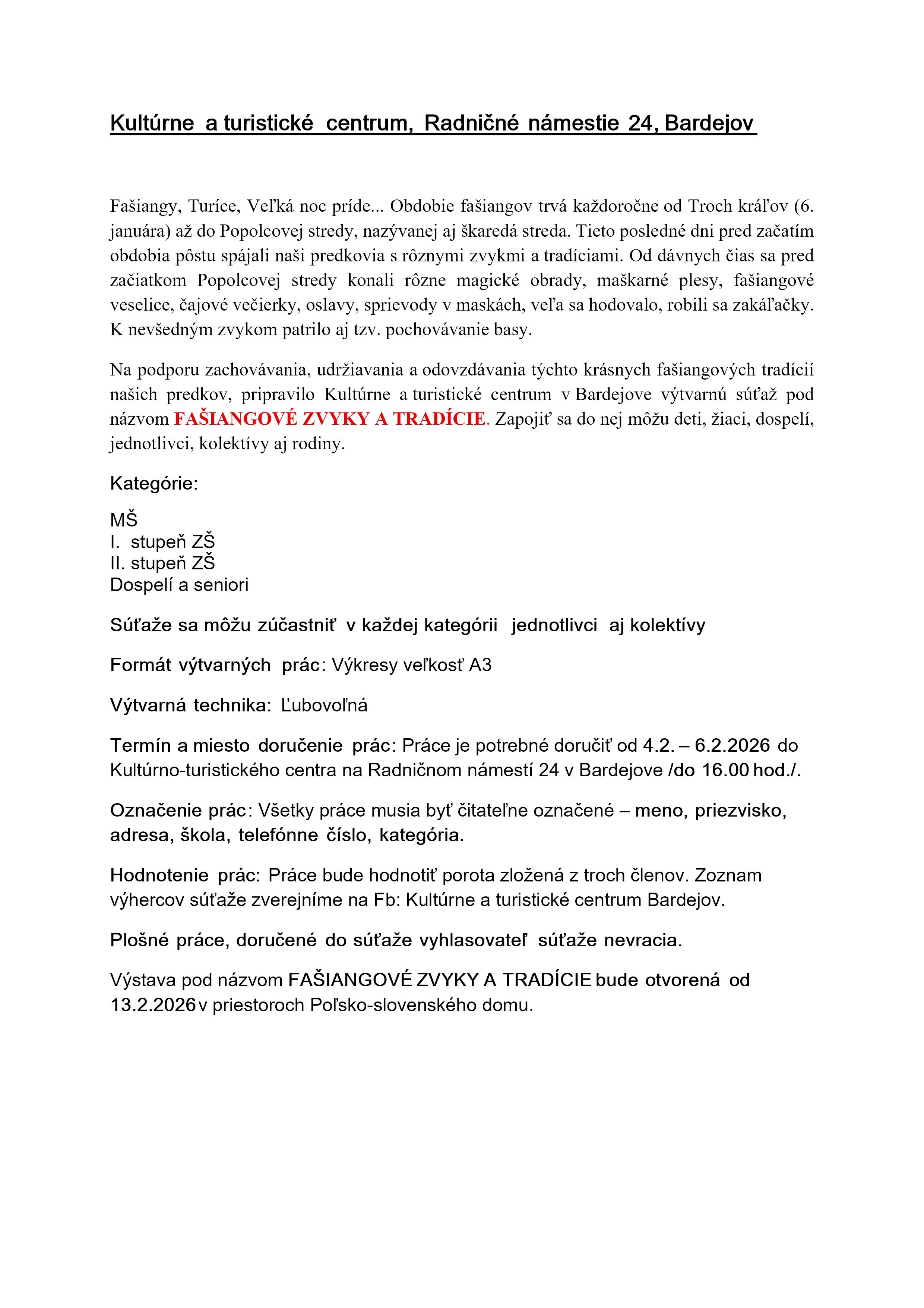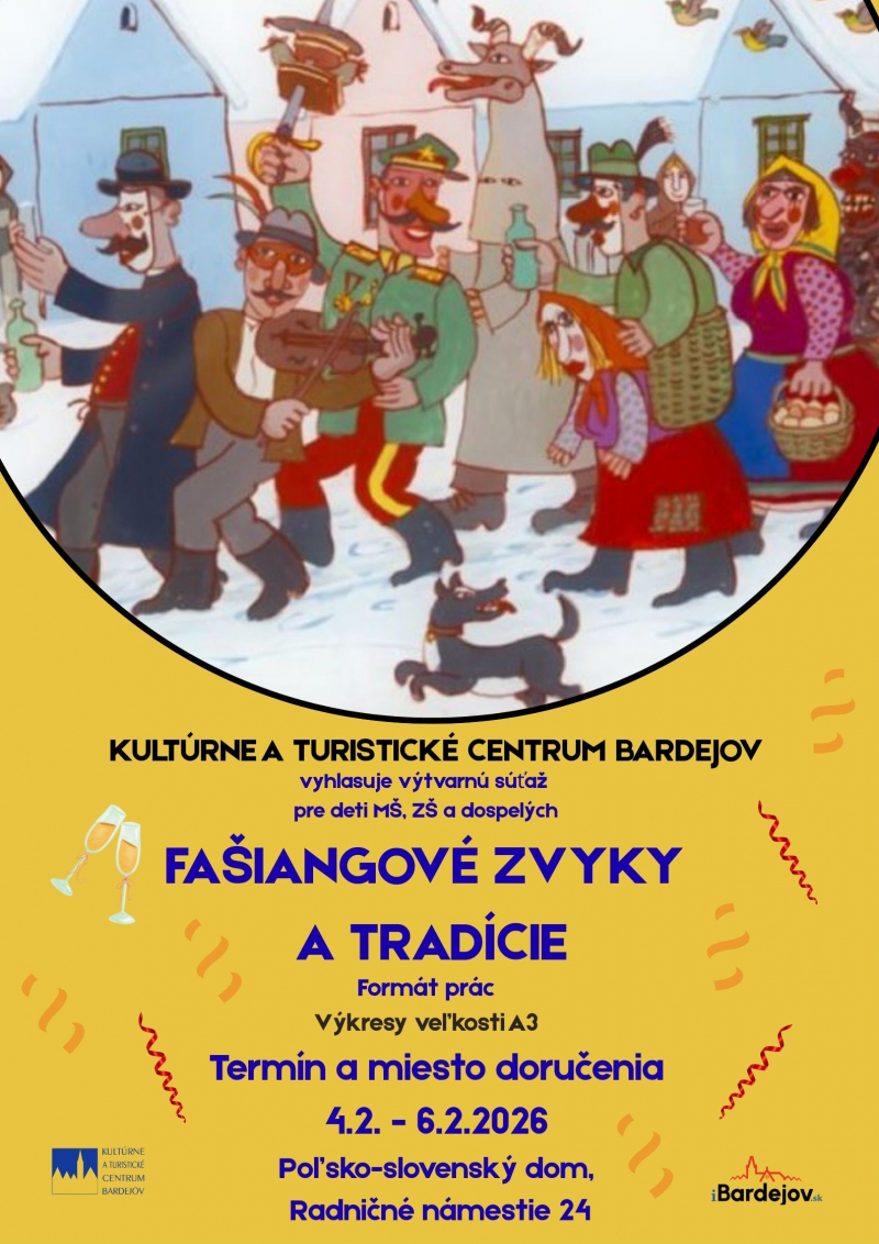 Na podporu zachovávania, udržiavania a odovzdávania týchto krásnych fašiangových tradícií našich predkov, pripravilo Kultúrne a turistické centrum v Bardejove výtvarnú súťaž pod názvom FAŠIANGOVÉ ZVYKY A TRADÍCIE. Zapojiť sa do nej môžu deti, žiaci, dospelí, jednotlivci, kolektívy aj rodiny.
