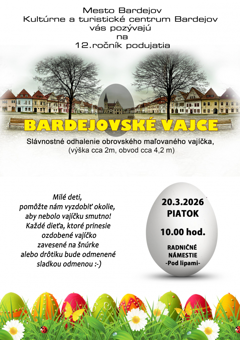 už o niekoľko dní tu opäť máme sviatky jari - Veľkú noc. Aj tento rok bude od 20.3.2026 o 10.00 hod. na Radničnom námestí v Bardejove uložené obrovské maľované vajce. Chceli by sme však skrášliť aj jeho okolie, preto Kultúrne a turistické centrum Bardejov pozýva deti všetkých MŠ a ZŠ v Bardejove, aby sa zapojili a pomohli nám okolie najväčšieho ručne maľovaného vajca vyzdobiť. Všetky deti, ktoré vytvoria 3D vajíčka, alebo namaľujú plošné práce a prinesú ich 20.3.2026 na Radničné námestie, kde nimi ozdobíme okolie ručne maľovanej kraslice, budú za svoju snahu odmenené sladkosťami.