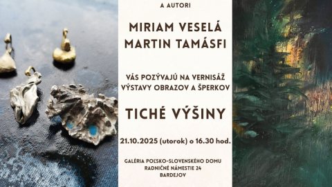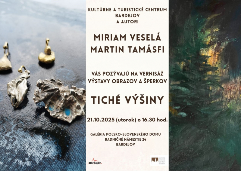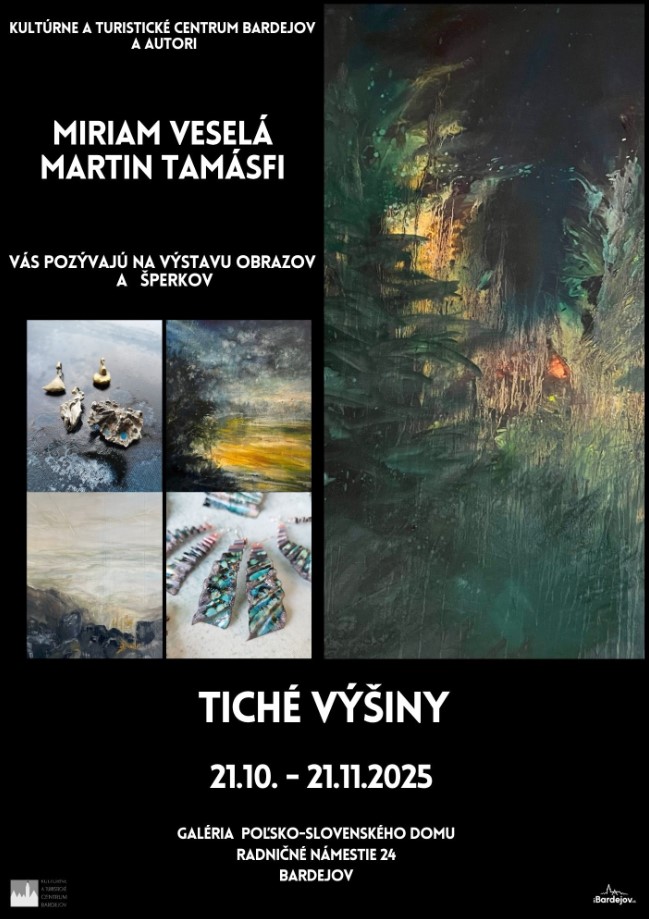 Pozývame vás na výstavu dvoch umelcov Miriam Veselej a Martina Tamásfiho - Tiché výšiny. Vernisáž výstavy sa bude konať v utorok dňa 21.10.2025 o 16:30 hod. v galérii Poľsko-slovenského domu na Radničnom námestí 24 v Bardejove. Výstava potrvá do 21.11.2025. Tešíme sa na vás!